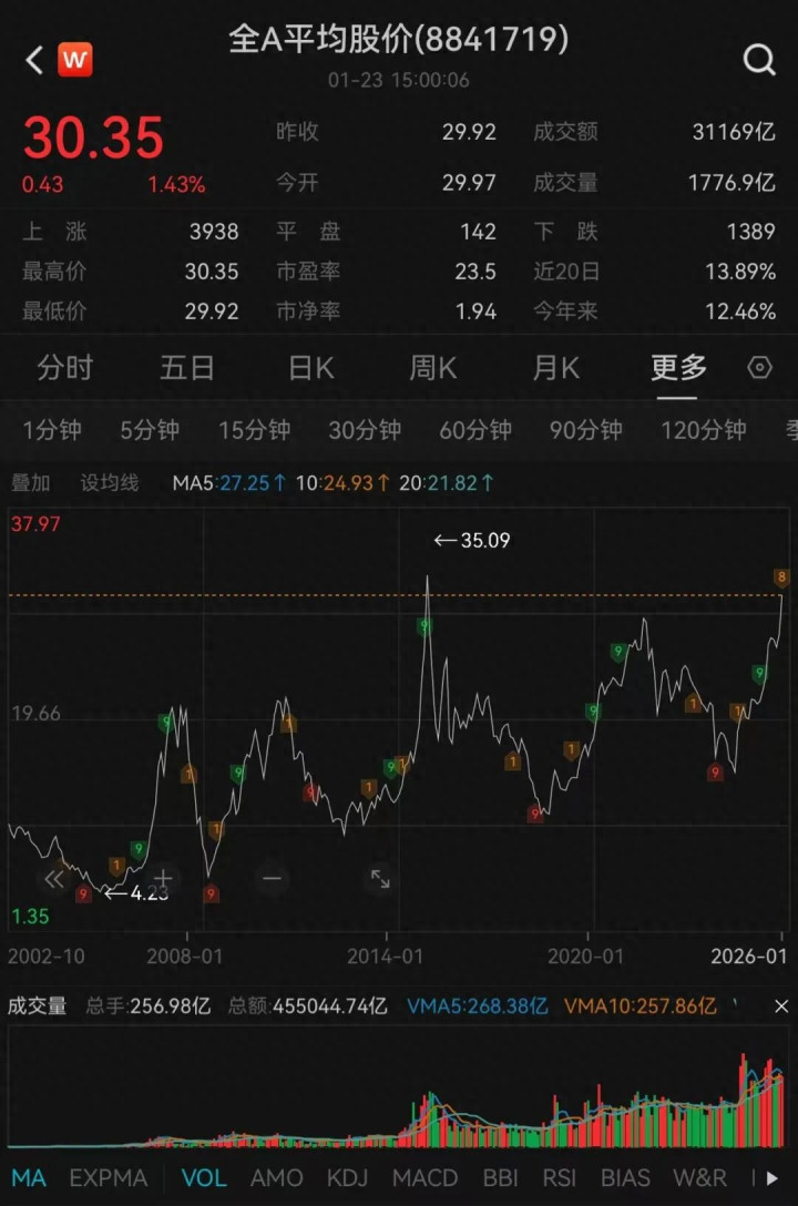 全A平均股价已经高于21年,略低于15年的高点,位置和估值都让人心惊胆战。